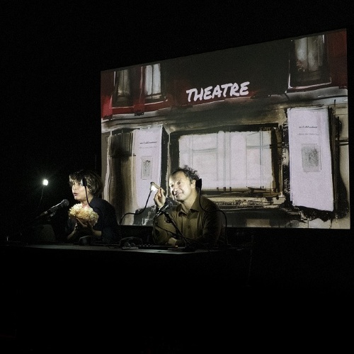 Deux comédiens sont assis à une table toute noire. On voit seulement le haut de leur corps, comme dans un petit théâtre magique. Sur la table, il y a des accessoires pour jouer et faire semblant. Avec des perruques, des chapeaux ou des lunettes, ils deviennent plein de personnages différents. Derrière eux, des images apparaissent pour montrer les décors, comme au cinéma. La lumière change, la musique commence, l’histoire avance vite. Le spectacle dure deux petites histoires de 20 minutes, avec une pause entre les deux.